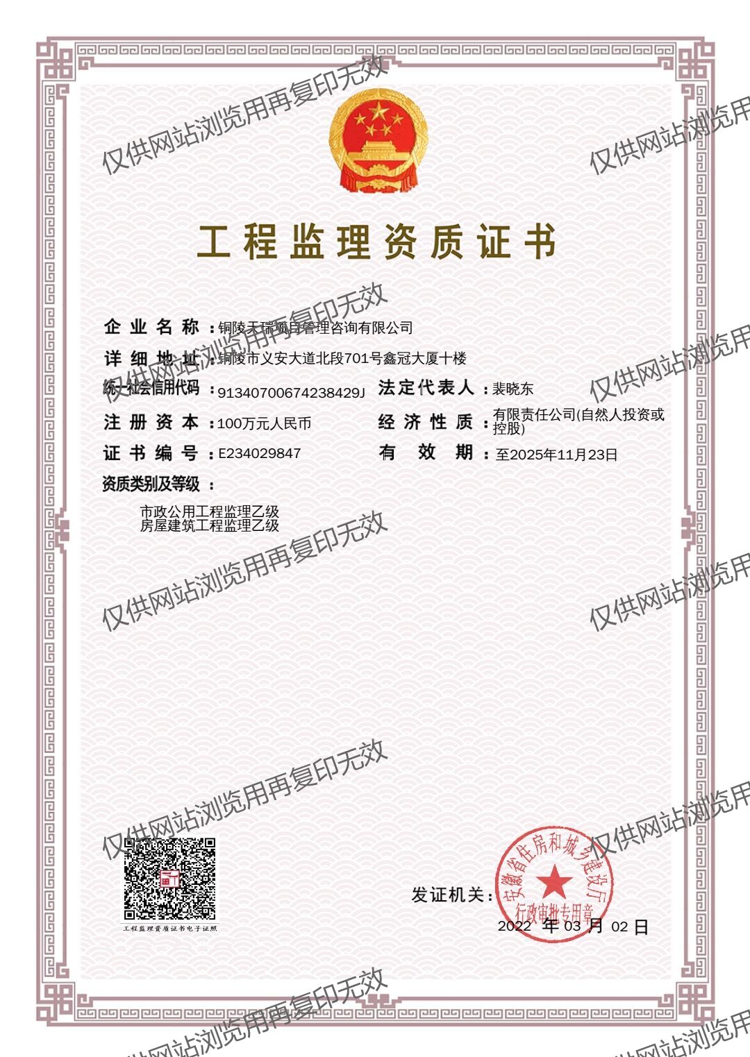 銅陵天瑞項目管理公司具有:工程監(jiān)理乙級資質(zhì)、工程造價乙級資質(zhì)、招標(biāo)代理及政府采購資質(zhì)(備案)、工程咨詢資質(zhì)(備案)等資質(zhì)。